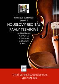 Buštěhradský Kruh přátel hudby srdečně zve na zahajující koncert sezony 2025, na kterém si pro Vás připravil opravdovou lahůdku klasické komorní hudby, a to houslový recitál Pavly Tesařové, který zazní již zítra v úterý 25.3.2025 od 19:30 hodin ve Velkém sále ZUŠ Buštěhrad. V programu zazní hudba Bedřicha Smetany, Antonína Dvořáka, Johannesa Brahmse, Eugéne Ysaÿe, Miroslava Hoška, Václava Smita, za klavírního doprovodu Martina Fily. Vstupné je dobrovolné. Pavla Tesařová patří mezi nejlepší mladé umělce současné scény klasické hudby v ČR, kteří si postupně získávají uznání i na prestižních zahraničích hudebních pódiích, akcích, soutěžích jako i na univerzitách coby vyhledávaný hudební pedagog. V r. 2023 se stala vítězkou Mezinárodní online hudební soutěže L. van Beethovena, kterou pořádá Organizace online hudebních soutěží v Británii. Jejím posledním úspěchem je nedávné vítězství v konkurzu na pozici koncertní mistryně Pražské komorní filharmonie. Její celý umělecký životopis si můžete přečíst v kalendáři akcí: https://www.mestobustehrad.cz/nas-bustehrad/kalendar/2025-03-25/ S pozdravem a přáním pěkného dne Zdeňka Vestfálová Městský úřad Buštěhrad