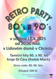 Zveme vás na RETRO PARTY s hity 80. a 90. let, která se koná 12. dubna 2025 od 20:00 v Lidovém domě v Chrástu. Přijďte si užít skvělou zábavu s DJ Čárou, nezapomeňte na dress code! Vstupné 100 Kč.