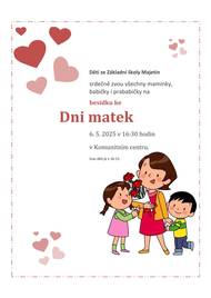 Děti ze Základní školy Majetín zvou všechny maminky, babičky i prababičky na slavnostní besídku ke Dni matek, která se uskuteční v úterý 6. května 2025 od 16:30 v Komunitním centru. Přijďte si s námi užít milé odpoledne plné písniček, básniček a radosti.