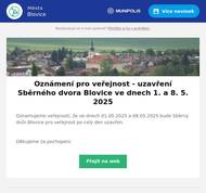 Oznamujeme veřejnosti, že ve dnech 01.05.2025 a 08.05.2025 bude Sběrný dvůr Blovice pro veřejnost po celý den uzavřen. Děkujeme za pochopení.