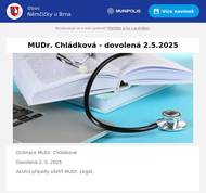 Ordinace MUDr. Chládkové Dovolená 2. 5. 2025 Akutní případy ošetří MUDr. Legát.