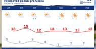 Chladné dny, které přinesla víkendová studená fronta, budou v Česku pokračovat celý tento týden. Odpolední teploty jen výjimečně překročí 15 stupňů Celsia. V noci budou klesat i pod nulu, a to až do pátku varují meteorologové před četnými přízemními mrazíky. Objeví se déšť a přeháňky, srážek však nebude mnoho, vyplývá z předpovědi Českého hydrometeorologického ústavu (ČHMÚ).