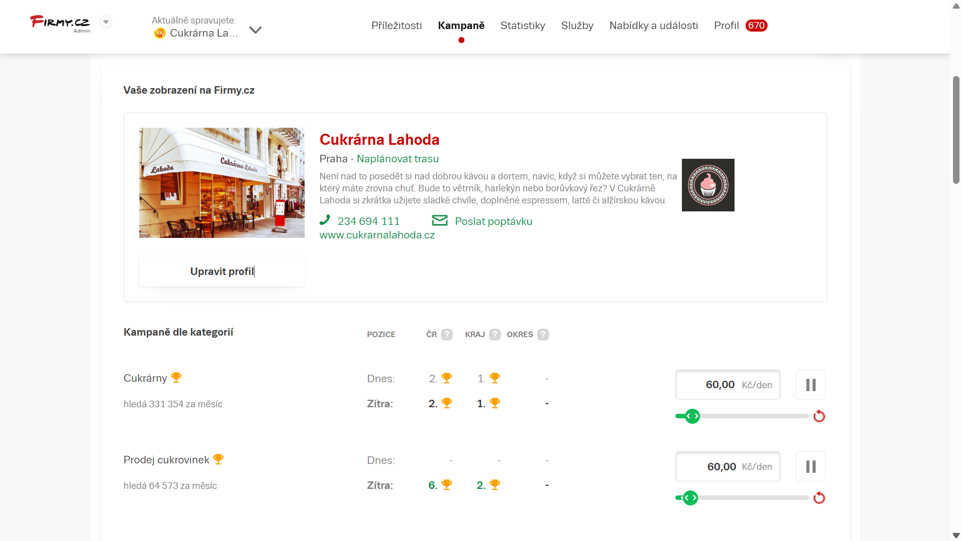 Kampaň můžete nastavit detailněji, a to na přesné pozice zvolené kategorie nebo klíčová slova ve vyhledávání i na Firmy.cz. Díky tomuto nastavení přesněji zacílíte na lidi, kterým by se měl zobrazovat váš profil.