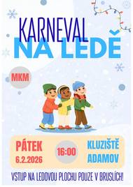 Městský klub mládeže v Adamově pořádá v pátek dne 6. února 2026 na kluzišti Petra Jilemnického Karneval na ledě. Čekají vás veselé soutěže, tanec, odměny… Začátek v 16:00 hodin. VSTUP NA LEDOVOU PLOCHU POUZE V BRUSLÍCH! Vstup je zdarma.