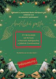 Základní a mateřská škola Adršpach vás srdečně zve na vánoční vystoupení, které se koná 18. prosince 2025 v 16. hodin v jídelně Continental v Horním Adršpachu. Přijďte si užít vánoční náladu a podpořit naše žáky a děti. Těšíme se na vaši účast.