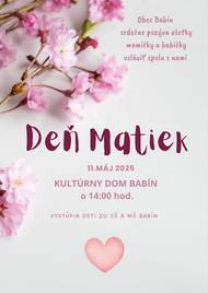 Milé mamy, srdečne Vás pozývame na DEŇ MATIEK, ktorý sa uskutoční dňa 11.5.2025 o 14.00 hod v Kultúrnom dome v Babíne. Spolu s deťmi z MŠ a ZŠ oslávime Váš sviatok ❤️. Čakajú Vas krásne pesničky, venované mamkám. Tešíme sa na Vás