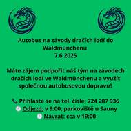 Žádáme občany, kteří mají zájem o autobusovou dopravu na závody dračích lodí ve Waldmünchenu, aby se přihlásili na tel. čísle 724 287 936. Autobus bude odjíždět v 9:00 z parkoviště u Sauny. Návrat je plánován přibližně na 19:00.