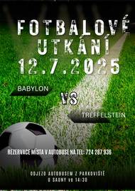 Zveme Vás na fotbalové utkání Babylon - Treffelstein, které se koná dne 12.7.2025 od 16:00 v Treffelsteinu. Využijte možnost rezervace místa v autobuse, který odjíždí z parkoviště u Sauny v 14:30. Pro více informací a rezervace volejte na telefonní číslo 724 287 936.
