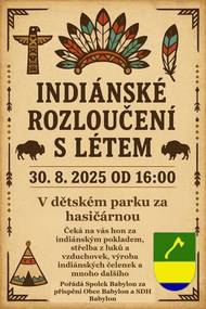 V sobotu 30. srpna 2025 od 16:00 se v dětském parku za hasičárnou koná Indiánské rozloučení s létem. Čeká vás střelba z luků a vzduchovek, výroba indiánských čelenek a další zajímavé aktivity.