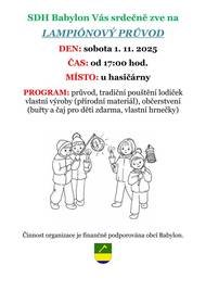 SDH Babylon Vás srdečně zve na lampiónový průvod, který se uskuteční v sobotu 1. listopadu 2025 od 17:00 hodin u hasičárny.