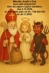 Mikuláš, Anděl a Čert jsou opět připraveni! Kdo má zájem o jejich návštěvu 5.12.2025, ať volá nebo píše na tel.: 728 624 534 do 28.11.2025.