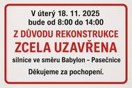 V úterý 18. listopadu 2025 bude od 8:00 do 14:00 z důvodu rekonstrukce uzavřena silnice ve směru Babylon - Pasečnice.