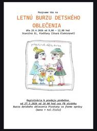 Pozývame vás na letnú burzu detského ošatenia, ktorá sa uskutoční 25.4.2026 od 9:00 do 12:00 v priestoroch starej elektrárne, Staničná 51, Piešťany.