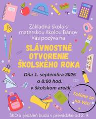 Pozývame Vás na Slávnostné otvorenie školského roka, ktoré sa uskutoční dňa 1. septembra 2025. Stretneme sa o 8:00 hod. v školskom areáli, potom sa žiaci presunú s triednymi učiteľmi do tried. Záver : 9:00 - 9:30 hod. /Rodičom odporúčame použiť parkovisko na asfaltovej ploche za školou./