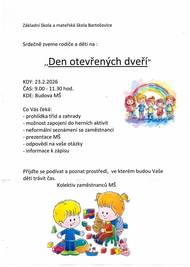 ZŠ a MŠ Bartošovice srdečně zve rodiče a děti dne 23.2.2026 na "Den otevřených dveří" v budově MŠ Bartošovice. Přijďte se podívat a poznat prostředí, ve kterém budou Vaše děti trávit čas.