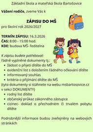 Zápis do MŠ pro školní rok 2026/2027 se uskuteční dne 16.3.2026 v budově MŠ - ředitelna. Podrobnější informace budou zveřejněny na webových stránkách.