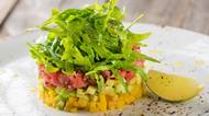 Smažený stočený sýr se šunkou a zeleninovými hranolkami