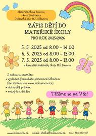 Mateřská škola Bavorov vás zve k zápisu pro rok 2025/2026. Zápis se koná 5.května od 8:00 do 14:00 hodin, 6.května od 8:00 do 13:00 hodin a 7.května od 8:00 do 13:00 hodin v kanceláři ředitelky MŠ Bavorov.