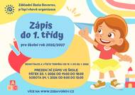 Základní škola Bavorov, příspěvková organizace zve k zápisu do 1.třídy. Registrace a výběr termínu od 15.1. do 22.1.2026. Prezenční zápis ve škole v pátek 23.1.2026 od 14:00 do 18:00 a v sobotu 24.1.2026 od 8:00 do 12:00. Více na www.zsbavorov.cz