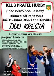 Belkovice - Lastany: Dnes od 14 hodin probiha hudebni produkce Klubu pratel hudby. Soubor Triflauto + tvori zobcovi fletniste s pestrymi hracskymi zkusenostmi Program Tres doux compains prinasi prurez repertoarem fletnoveho ansamblu od 14. po 20. stoleti. Prijdte si tak poslechnout krasnou hudbu do kulturniho salu Parlament.