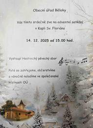 Obecní úřad Běloky Vás srdečně zve na advetní setkání v Kapli Sv. Floriána, které se uskuteční 14.12.2025 od 15:00 hodin. Těšit se můžete na vystoupení Hostivického pěveckého sboru a následně přátelské posezení s občerstvením ve společenské místností OÚ. Přijďte se společně naladit na vánoční atmosféru.