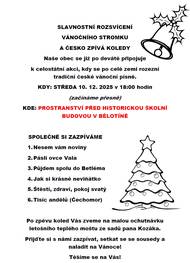 Naše obec se již po deváté připojuje k celostátní akci, kdy se po celé zemi rozezní tradiční české vánoční písně. KDY: STŘEDA 10. 12. 2025 v 18:00 hodin (začínáme přesně) KDE: PROSTRANSTVÍ PŘED HISTORICKOU ŠKOLNÍ BUDOVOU V BĚLOTÍNĚ