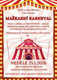 Obec Bělotín a SPZŠ Vás zvou na Maškarní karneval 25. ledna 2026 v Kulturním domě od 14:00. Můžete se těšit na zábavný animační program Cirkus show, plný her, soutěží a písniček. Děti v maskách mají vstup zdarma, ostatní zaplatí 50 Kč.