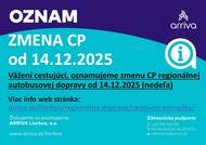 Vážení cestujúci, spoločnosť ARRIVA Liorbus a.s. oznamuje, že od 14.12.2025 (nedeľa) sa menia cestovné poriadky regionálnej autobusovej dopravy Viac informácií nájdete na webovej stránke: arriva.sk/liorbus/regionálna-doprava/cestovne-poriadky/