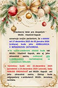 Všeobecný lekár pre dospelých MUDr. Vlastimil Kapcát oznamuje svojím pacientom, že v období od 17.decembra 2025 do 05.januára 2026 (vrátane) bude jeho AMBULANCIA V BEŇADIKOVEJ ZATVORENÁ.