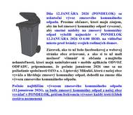 Zverejňujeme Harmonogram vývozu jednotlivých zložiek odpadu v mesiaci JANUÁR 2026 05.januára 2026 (pondelok) - PAPIER 12.januára 2026 (PONDELOK) - KOMUNÁLNY ODPAD 16.januára 2026 (piatok) - PLASTY 27.januára 2026 (utorok) - SKLO