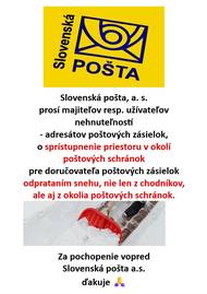 Slovenská pošta, a.s. prosí majiteľov resp. užívateľov nehnuteľností - adresátov poštových zásielok, o sprístupnenie priestoru v okolí poštových schránok pre doručovateľa poštových zásielok odprataním snehu, nie len z chodníkov, ale aj z okolia poštových schránok. Za pochopenie vopred ďakuje.