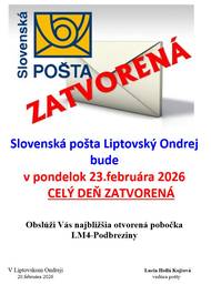 V PONDELOK 23.FEBRUÁRA 2026 bude Slovenská pošta Liptovský Ondrej CELÝ DEŇ ZATVORENÁ. Obslúži Vás najbližšia otvorená pobočka LM4-Podbreziny