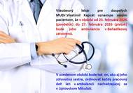 Všeobecný lekár pre dospelých MUDr.Vlastimil Kapcát oznamuje svojím pacientom, že v období od 23.februára 2026 (pondelok) do 27.februára 2026 (piatok) bude jeho ambulancia v Beňadikovej zatvorená.