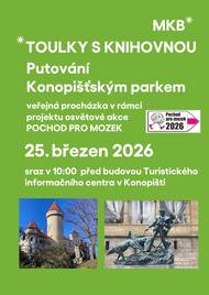 První letošní Toulky s knihovnou spojíme s akcí Pochod pro mozek. Ve středu 25. 3. vyrazíme do parku Konopiště. POZOR – sraz je v 10:00 u TIC Konopiště (č. 4), nikoli na Masarykově náměstí, jak bylo chybně uvedeno. Trasa cca 5 km, vhodná pro všechny.