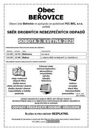 V sobotu 27.9.2025 proběhne svoz nebezpečného odpadu. V Beřovicích na návsi od 11:45 do 12:15 a v Bakově u hasičárny od 12:25 do 12:40.