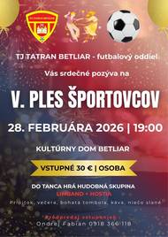 TJ Tatran Betliar pozýva všetkých športovcov a ich priateľov na V. Ples športovcov, ktorý sa uskutoční 28. februára 2026 o 19:00. Užite si večer plný zábavy s hudobnou skupinou LIMBAND a ďalšími hosti.