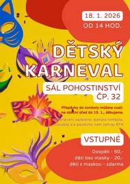 Připomínáme, že Dětský karneval v Bezděkově nad Metují se uskuteční již za týden, v neděli 18. ledna 2026 od 14:00 hodin na sále Pohostinství čp. 32.