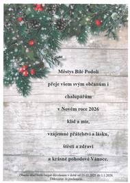 Městys Bílé Podolí chce upozornit občany, že dne 22.12.2025 bude úřad otevřen od 8:00 do 12:00 z důvodu zkrácené pracovní doby a čerpání dovolené. Tímto děkujeme za pochopení.