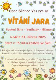 Pojďte s námi v neděli 23. března 2025 přivítat jaro při průvodu místními částmi naší obce - začínáme v 15:00 hod. ve Škrli před kostelem, přes Voděrady dojdeme až k areálu dětského hřiště v Bílencích, kde na účastníky bude čekat překvapení a otevřený hostinec. Pro děti jsou po cestě připraveny úkoly a drobné odměny. Doporučujeme vhodnou obuv, budete-li chtít s sebou květinu (živou, umělou či vyrobenou) a oblečení v jarních veselých barvách. Těšíme se na shledání!