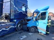 Dopravní nehoda dodávky a nákladního auta zpomalila provoz a vyžádala si zásah hasičů a záchranářů. Jedna osoba byla převezená k ošetření.
