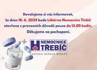 Dne 18. 6. 2024 provozní doba Lékárny Nemocnice Třebíč mimořádně z provozních důvodů pouze do 15.00 hodin.