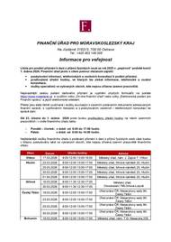 Finanční úřad pro Moravskoslezský kraj upozorňuje, že lhůta pro podání přiznání k dani z nemovitých věcí na rok 2026 končí 2. února 2026. V období od 26. ledna do 2. února 2026 budou prodlouženy úřední hodiny, kdy budou občanům k dispozici specialisté. Více informací v přiložených souborech.