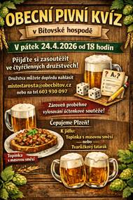 Obecní pivní kvíz proběhne v pátek 24. dubna 2026 od 18 hodin v sále Obecního domu v Bítově.