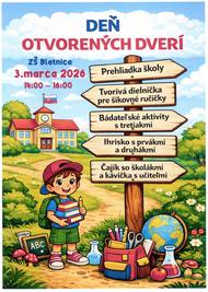 Milí rodičia a milí budúci školáci! Základná škola v Blatnici vás srdečne pozýva na Deň otvorených dverí, kde budete mať možnosť nahliadnuť do priestorov našej školy, spoznať našich učiteľov a vyskúšať si, aké je to byť školákom. Kedy sa stretneme? Dátum: 3. marca 2026 Čas: od 14:00 do 16:00 hod. Čo sme si pre vás pripravili? Pripravili sme bohatý program plný zábavy a objavovania: Prehliadka školy: Spoznajte priestory, kde sa deti učia a hrajú. Tvorivá dielnička: Kreatívne aktivity pre všetky „šikovné ručičky“. Bádateľské aktivity: Vyskúšajte si pokusy a objavy spolu s našimi tretiakmi. Zábava na ihrisku: Hry a pohyb s prvákmi a druhákmi. Posedenie pri občerstvení: Pozývame vás na „čajík so školákmi“ a „kávičku s učiteľmi“, kde sa v neformálnej atmosfére môžete opýtať na všetko, čo vás zaujíma. Tešíme sa na vašu návštevu!