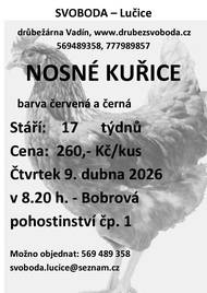 Firma Svoboda Lučice bude prodávat ve čtvrtek 9. dubna 2026 v 8.20 hodin u pohostinství č.p. 1 nosné kuřice, stáří 17 týdnů, cena 260,- Kč/kus, barva červená-Isa brown a černá-Morávia Objednání je možné na tel. 569 489 358 nebo emailem svoboda.lucice@seznam.cz