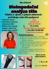 Vážení občané, srdečně Vás zveme na Den zdraví, který se uskuteční dne 19 dubna 2026 na Obecním úřadě v BOBROVÉ Součástí akce bude bioimpedanční analýza těla, která umožňuje zjistit složení těla, tedy podíl tuku, svalové hmoty a vody. Získáte také doporučení, jak podpořit své zdraví a kondici. Rezervace je nutná na telefonním čísle 776 840 999. Kapacita je omezena. Těšíme se na Vaši účast.