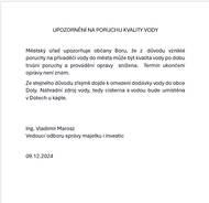 Upozornění na poruchu dodávky vody v Boru a v Dolech 09.12.2024