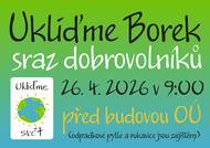 Dobrý den všem. Dovolte mi, abych Vás jménem OÚ Borek pozval na akci: "Ukliďme Borek", která se uskuteční v neděli 26. dubna 2026. Sraz dobrovolníků je v 09:00 hodin před budovou OÚ. Odpadkové pytle a pracovní rukavice jsou zajištěny. Těšíme se na Vás. S přáním hezkého dne Jaroslav Novák - starosta obce Borek.
