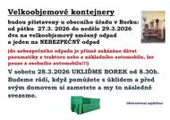 Velkoobjemové kontejnery na směsný a nebezpečný odpad budou přistaveny ve dnech 27.-29.3.2026 u obecního úřadu. Úklid obce se uskuteční v sobotu 28.3.2026 od 8.30 h.