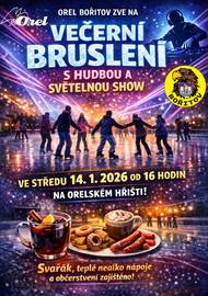 Orel Bořitov zve Večerní bruslení s hudbou a světelnou show. Středa, 14.1.2026, od 16:00 hodin na Orelském hřišti. Svařák, teplé nealko nápoje a občerstvení zajišzěno.